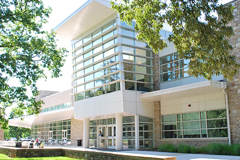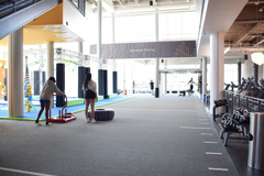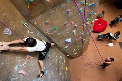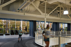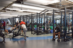 Next on the tour is Loyola's Fitness and Aquatic Center (FAC), which features the Mangione Aquatic Center, with its 14-lane, 25-yard pool; a 6,000-square-foot fitness center; a two-court gymnasium; a multi-activity court; a 30-foot indoor climbing wall; an elevated walking/jogging track; an outdoor adventure center; a functional fitness area and much more.
