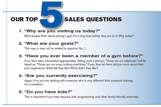 2. Ask relevant questions. Most health club tours are a menu of features that a staff person rattles off. Train your staff to be conversational and to ask appropriate, simple questions that help create a dialogue and a bit of a relationship. (See "Our Top 5 Sales Questions.")